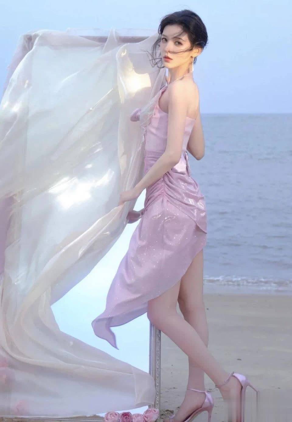 这条长裙堪称"神来之笔"。高开衩设计露出她笔直修长的美腿,同色系细高跟进一步拉长身材比例。双手轻搭薄纱的姿态,与背景的海天一线形成动人呼应。这造型将张予曦168cm的模特身材优势展现无遗,堪称海边行走的时尚画报。