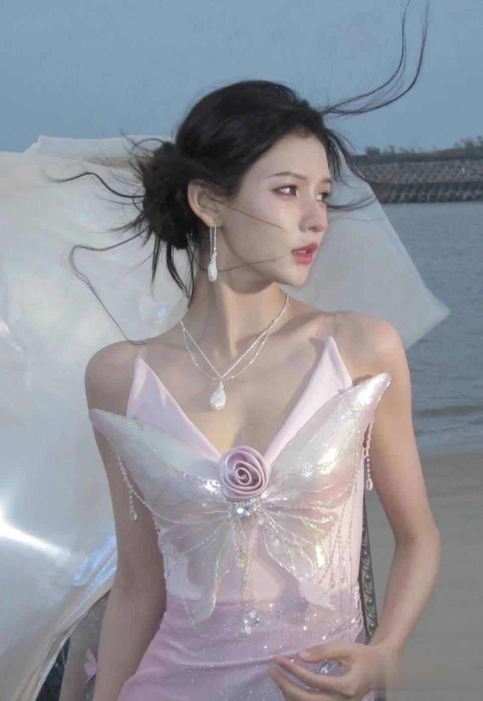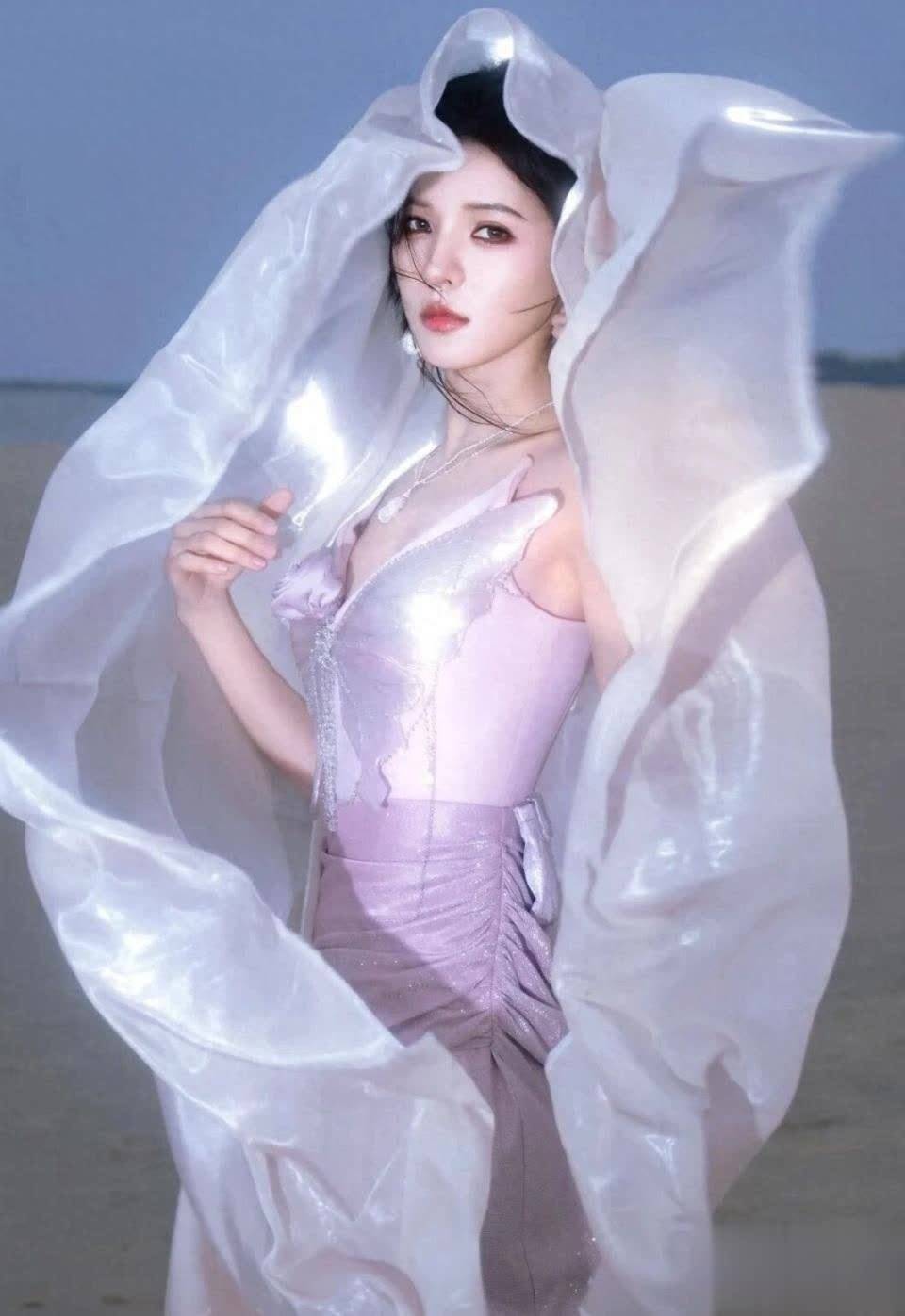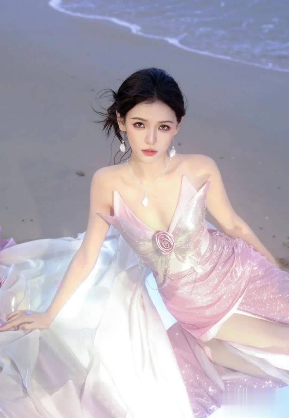 坐在沙滩上的张予曦,宛如童话中的人鱼公主。胸口的蝴蝶装饰与纱质裙摆,在浪花的衬托下更显梦幻。她撑地而坐的姿态既松弛又优雅,展现出她多年舞蹈功底塑造的形体美感。这张照片完美诠释了什么是"仙女本仙"。
