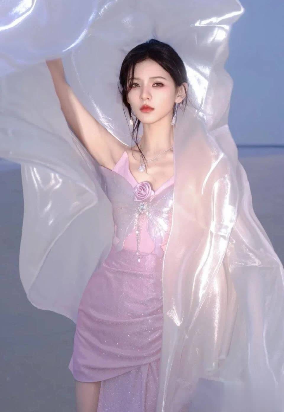 手扬薄纱的姿态灵动飘逸。这张照片展现了她可塑性极强的时尚表现力,无论是高定华服还是简约造型都能轻松驾驭。