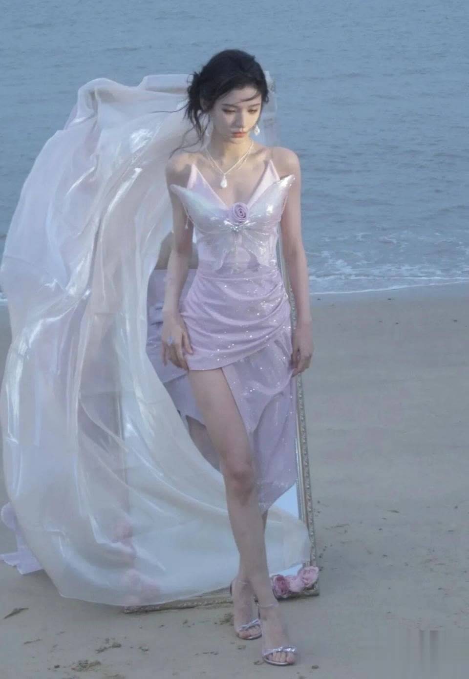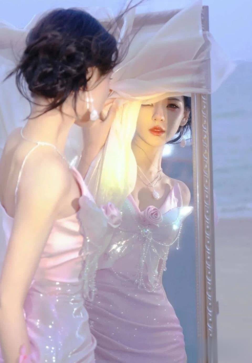 这张照片创意十足!张予曦立于镜前,她侧头轻抬薄纱的瞬间,仿佛在聆听大海的私语。这种"镜中镜"的构图方式,将她的侧颜优势与精致配饰完美结合,展现出不俗的时尚表现力。